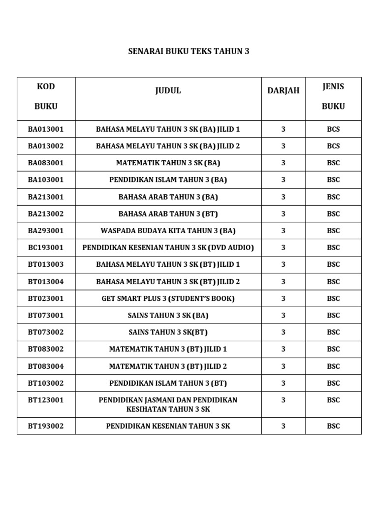 SPBT SKPHT 2020 SENARAI BUKU TAHUN 3 Kegunaan 2020 BIL KOD BUKU JUDUL BUKU HARGA 1 BT013003 Bahasa Melayu Tahun 3 SK BT Jilid 1 RM 580 2 BT013004 Bahasa Melayu Tahun 3 SK BT Jilid 2 RM 580 3 BT023001 Get Smart Plus 3 RM 3500 4 BT083002 Matematik Tahun 3 SK BT Jilid 1 RM 740 5 BT083004 Matematik Tahun 3. Senarai lengkap Mata pelajaran Sekolah Rendah 2020 ini disediakan untuk semakan guru-guru dan ibu bapa. Bil nama buku penerbit 1 akhlak - buku teks musleh 2 aqidah - buku teks musleh 3 fekah buku teks musleh 4 sirah buku teks musleh 5 bahasa arab buku teks musleh.